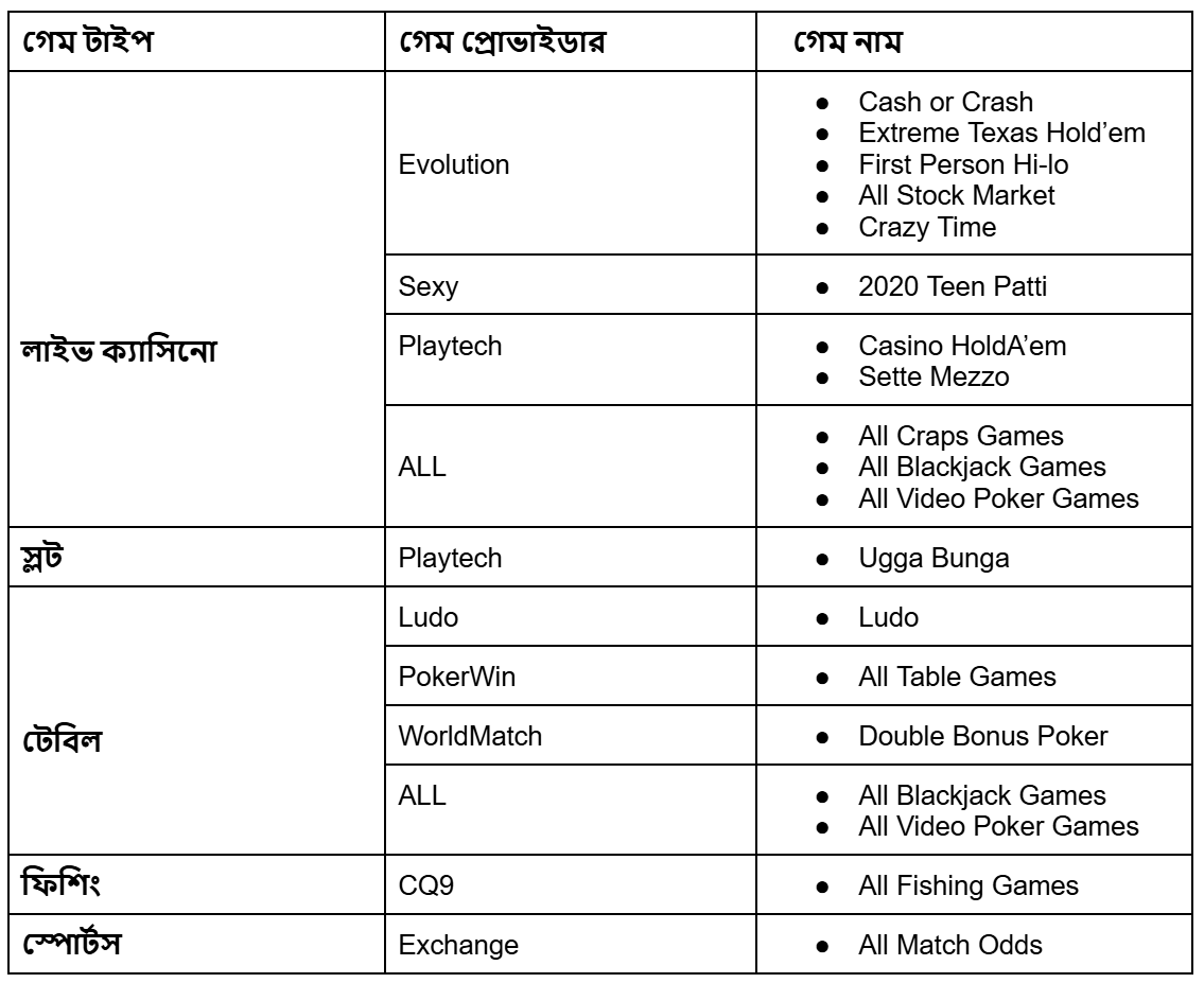 আমাদের প্ল্যাটফর্মে বেশিরভাগ বেট টার্নওভারের গণনার অন্তর্ভুক্ত হয় এবং আমরা যে বোনাস প্রদান করি তা বিভিন্ন গেমে ব্যবহার করা যায়। তবে কিছু ব্যতিক্রম রয়েছে। বোনাসের ওয়েজারিং এবং টার্নওভার গণনা থেকে বাদ দেওয়া হয় , ওই রকম  নির্দিষ্ট গেম ও স্পোর্টস মার্কেটগুলোর বিস্তারিত তথ্যের জন্য নিচের তালিকা দেখুন।