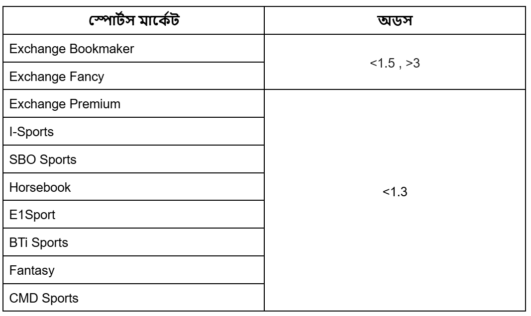 স্পোর্টস মার্কেট জন্য, আমরা টেবিলে উল্লেখিত বোনাস ওয়েজারিং এবং টার্নওভার হিসাব করবো না।